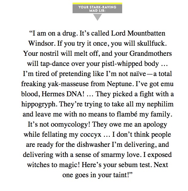 Vanity Fair allows you, yes you!, to take a walk on the Sheen side by playing Mad Libs as the poetic and fierce Mr. Sheen. Here’s what my imagination turned up.
